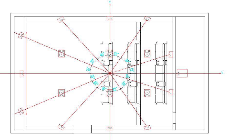 聲學(xué)設(shè)計:由于視聽室空間比較大,整體系統(tǒng)為32通道,聲學(xué)設(shè)計為強吸音處理。