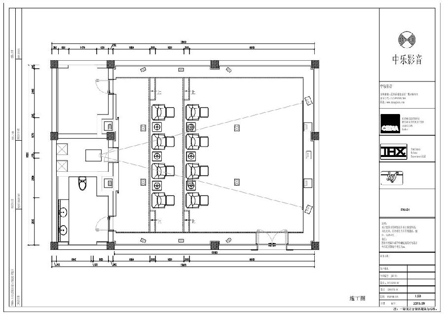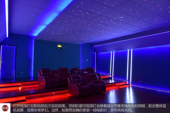 自建獨立影院室,建筑尺寸10.60m*9.50m*4.5m(長*寬*高),面積100.70m2。