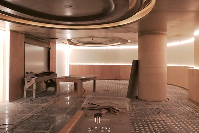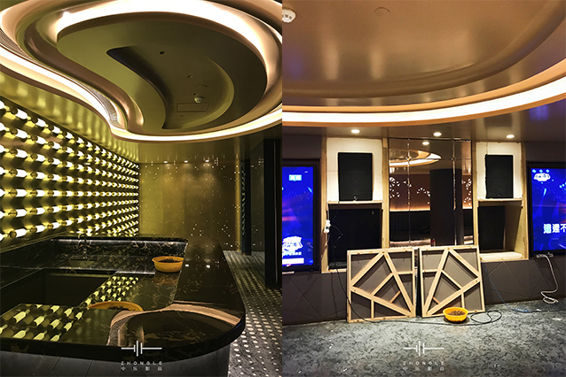 這是對卡拉OK要求極高的一個項目,面積非常大,但層高只有2.9米(完成面),天花內(nèi)部非常多梁影響造型設(shè)計。通過與專業(yè)的設(shè)計公司配合,最終給到業(yè)主滿意的設(shè)計方案。在聲學(xué)上最難處理的是減振和弧形造型的聲聚焦問題,通過中樂團(tuán)隊的精心設(shè)計和項目施工過程對每一個細(xì)小問題的處理,最終交付出非常滿意的答卷。通過這樣的高要求的項目,讓中樂團(tuán)隊的實力又一次得到升華。